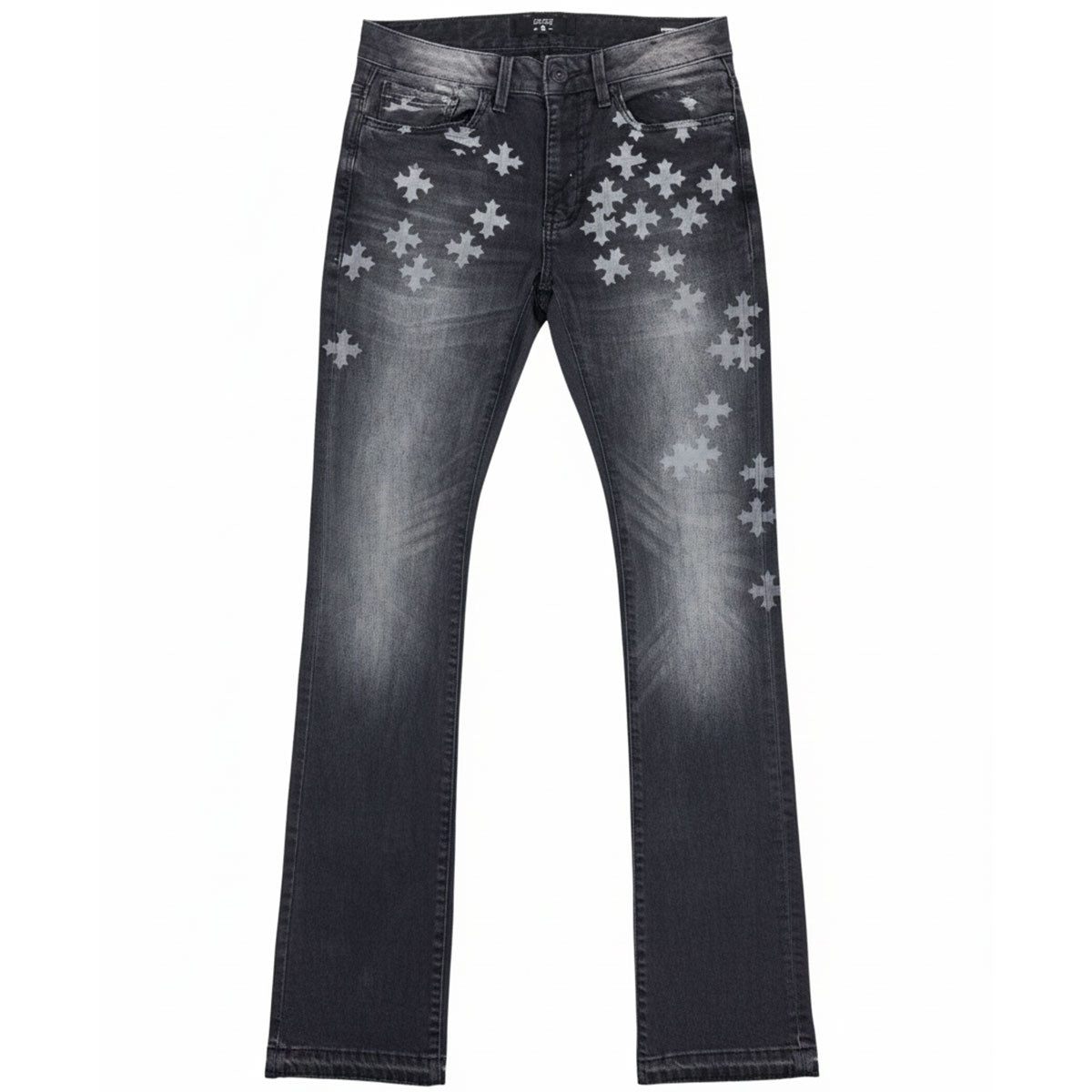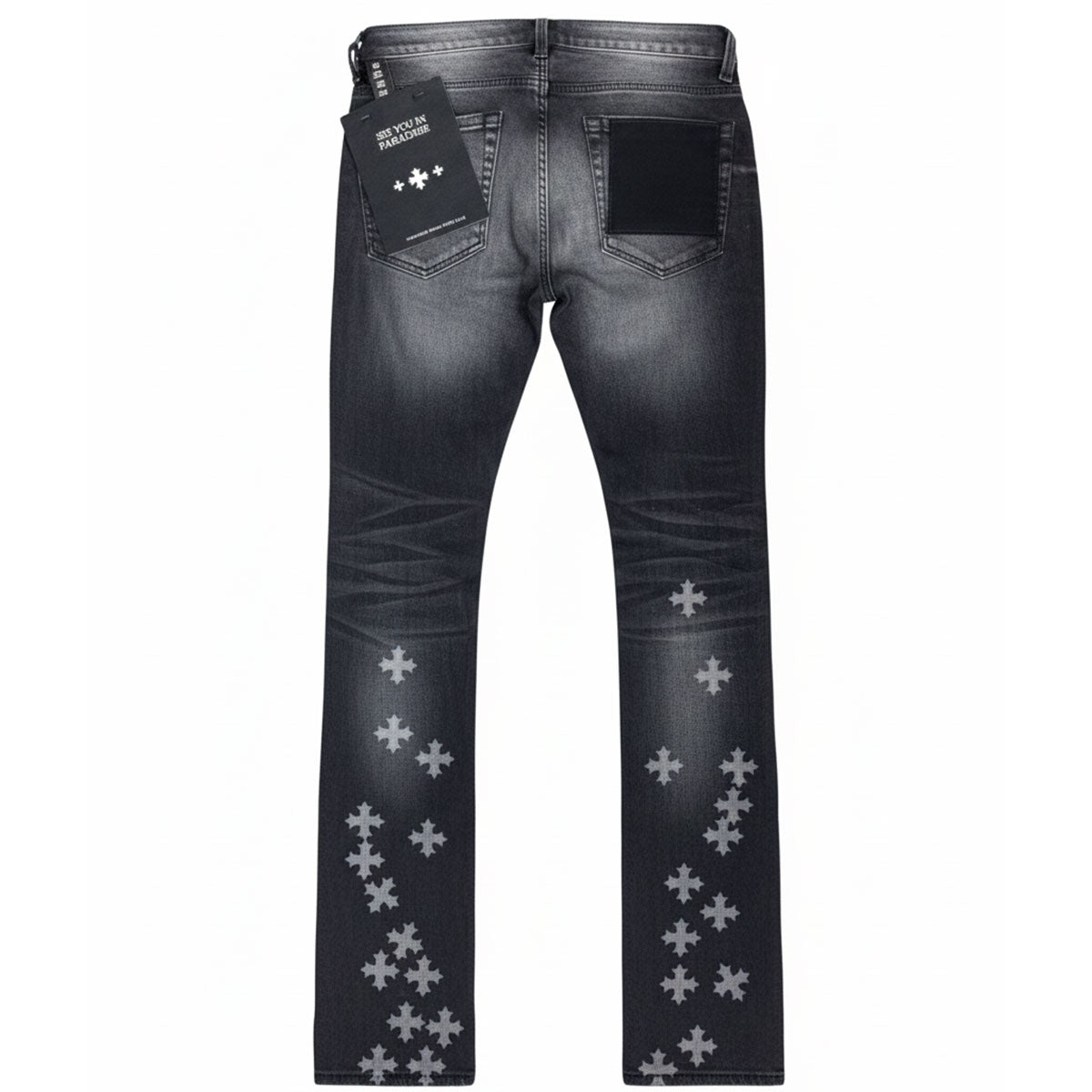 These regular rise, black shadow wash jeans from See You in Paradise feature multiple cross details on both sides, deep front pockets for smartphones, and an extended length flare for maximum stacks.