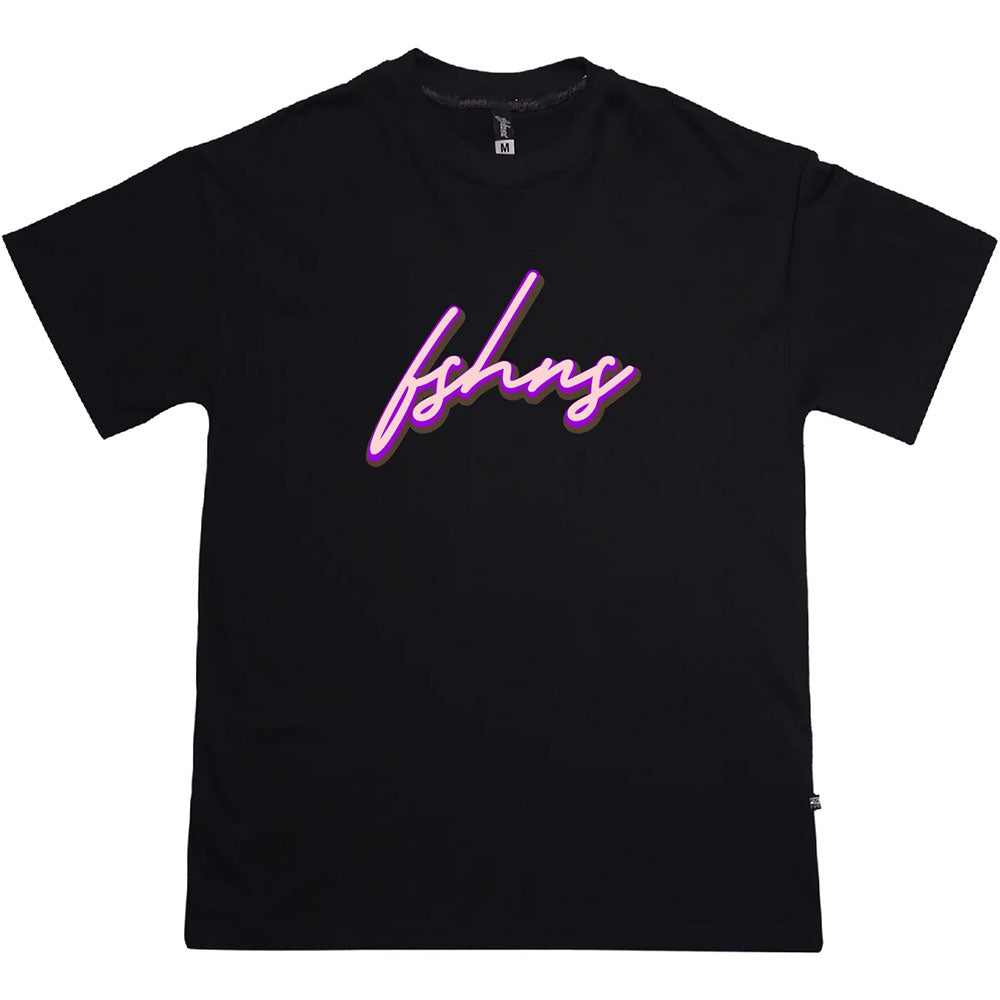 This black oversize t-shirt from FSHNS Brand features a triple classy logo in purple and mauve Paso Fino colors on front and a small rubber logo neck patch on rear.